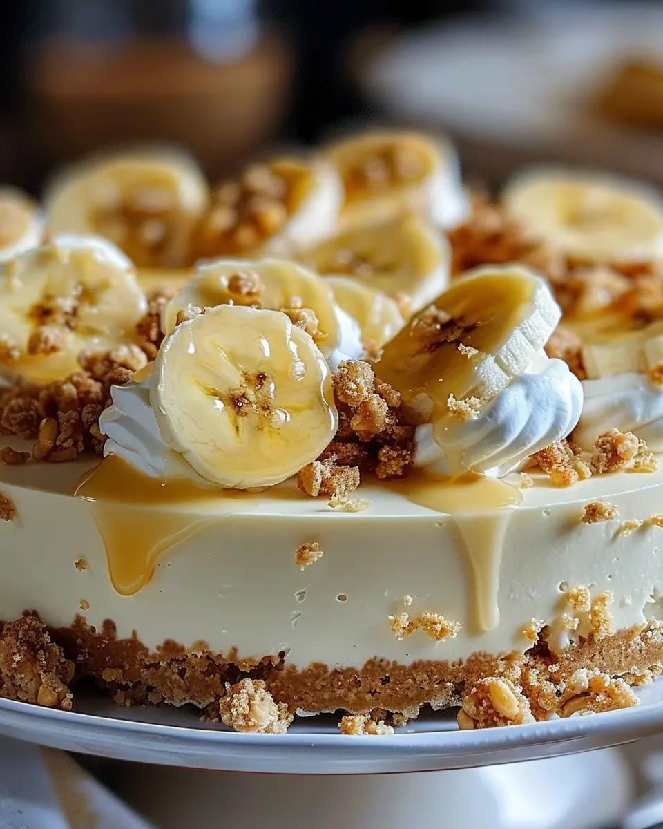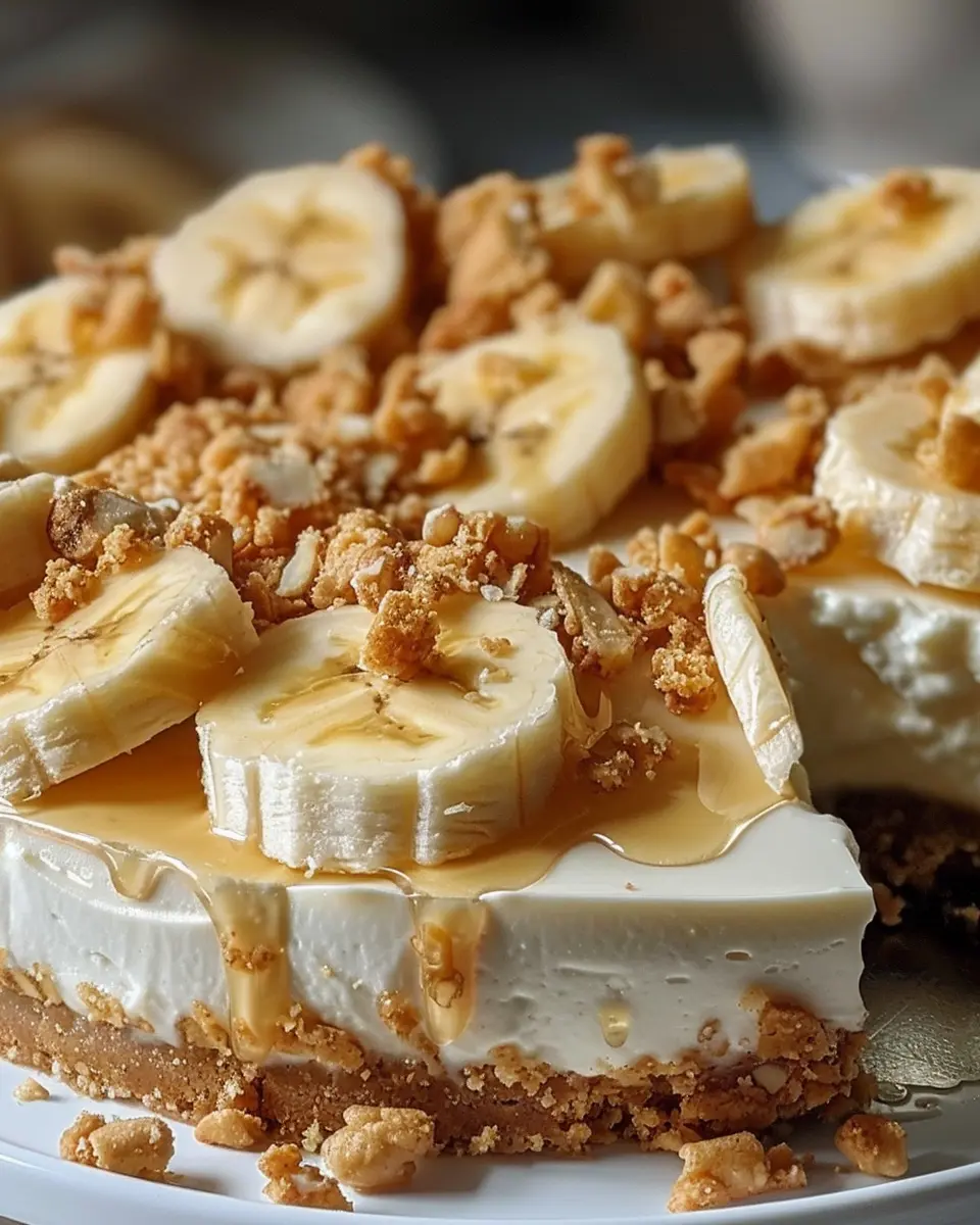 A rich and indulgent dessert that combines the flavors of banana pudding and cheesecake with a crunchy topping.