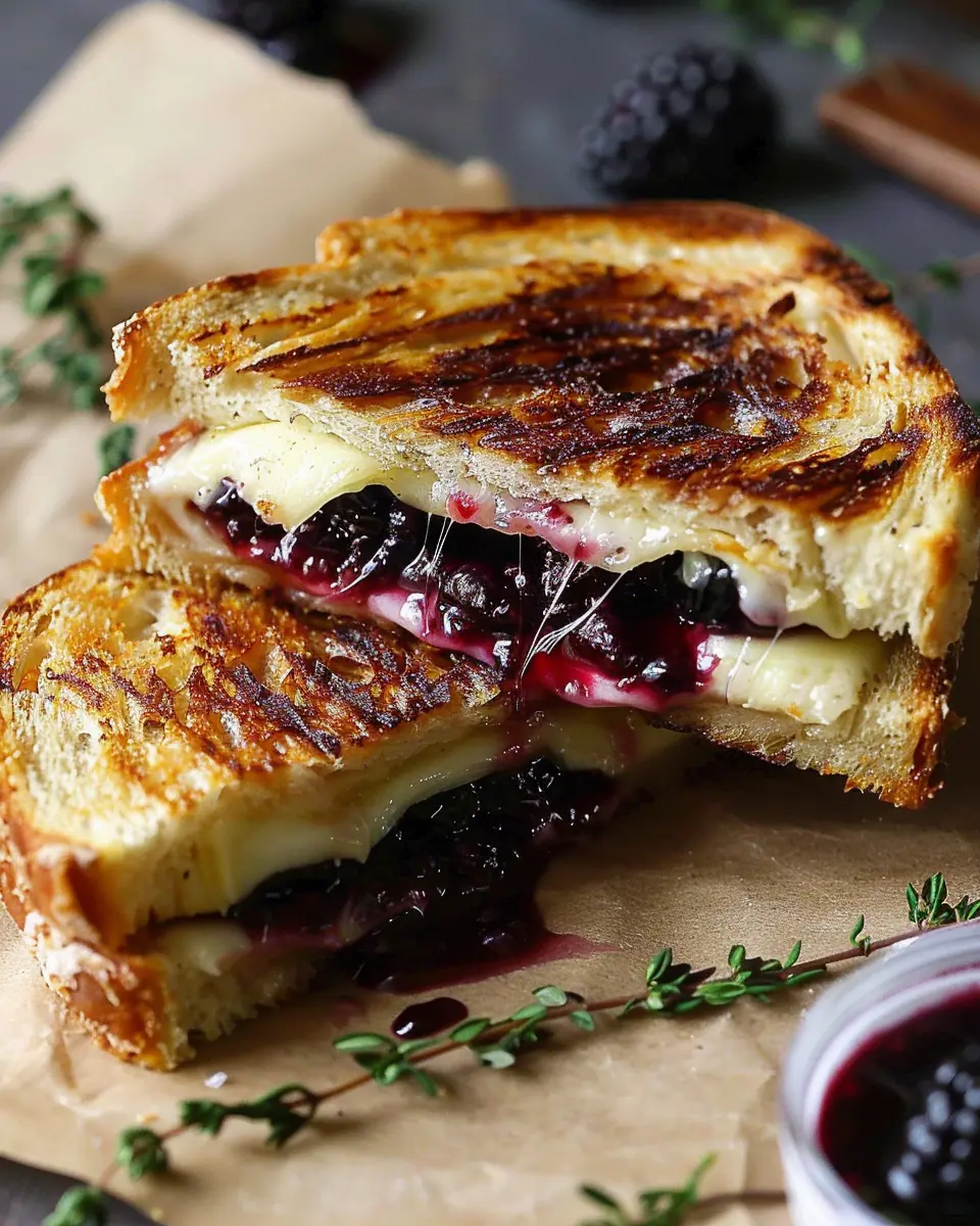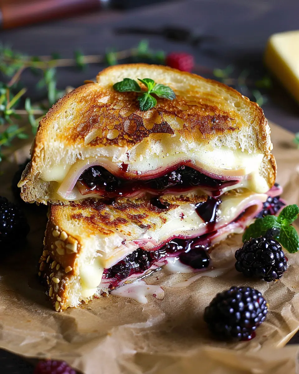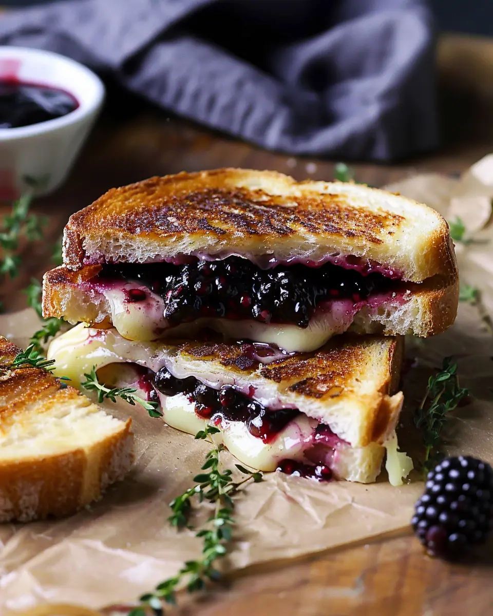 A deliciously indulgent grilled cheese sandwich featuring blackberry balsamic reduction and creamy brie.