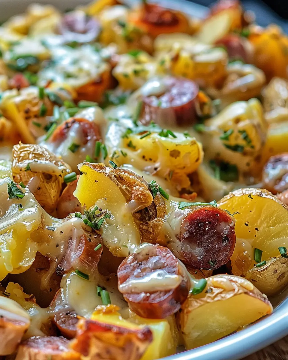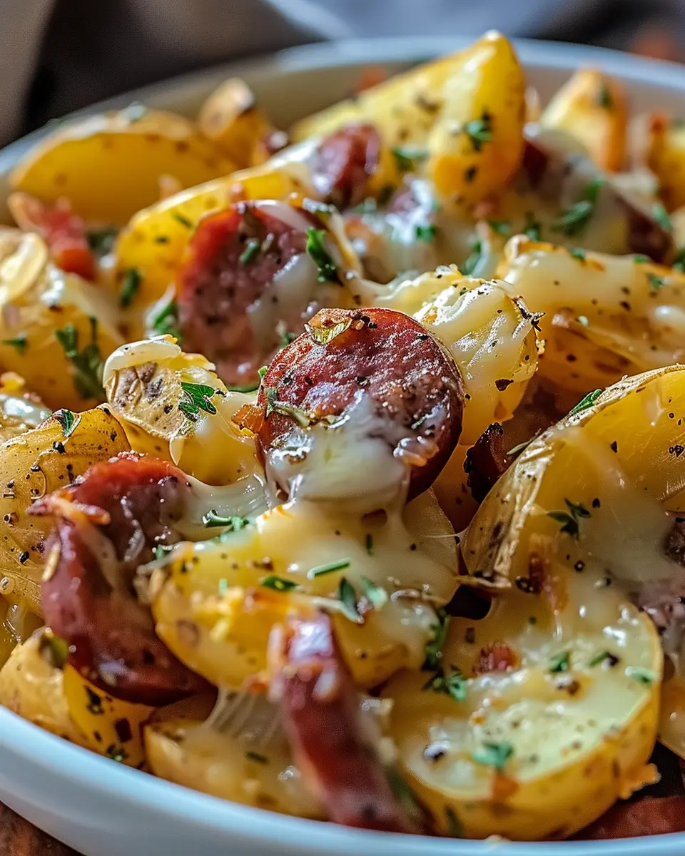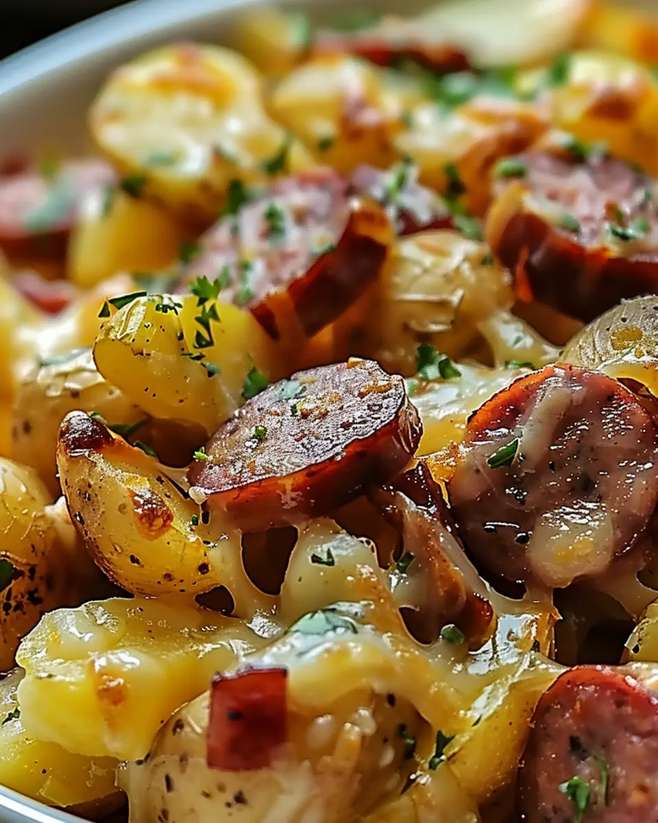 A warm and comforting dish that combines cheesy potatoes with smoky sausage for a perfect dinner.