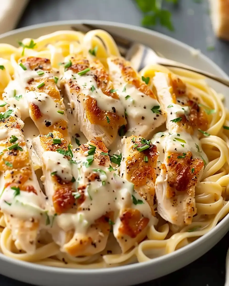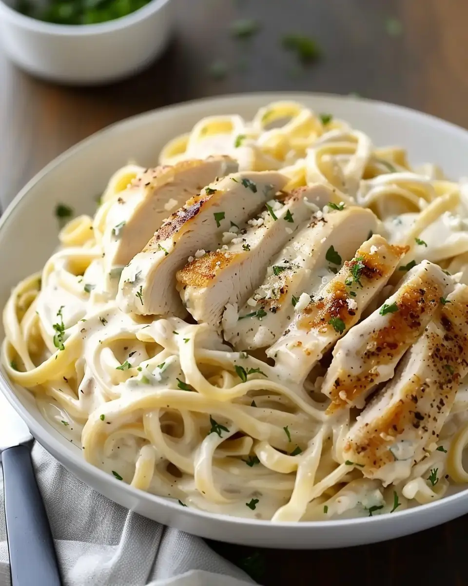 Once you’ve combined everything, it’s time to plate your Chicken Alfredo. For a beautiful presentation, twirl a portion of the pasta on a plate and top it with the sliced chicken. Sprinkle with additional Parmesan cheese, and don’t forget to add some chopped fresh parsley for a pop of color and freshness. A dash of freshly cracked black pepper on top gives it that final touch!