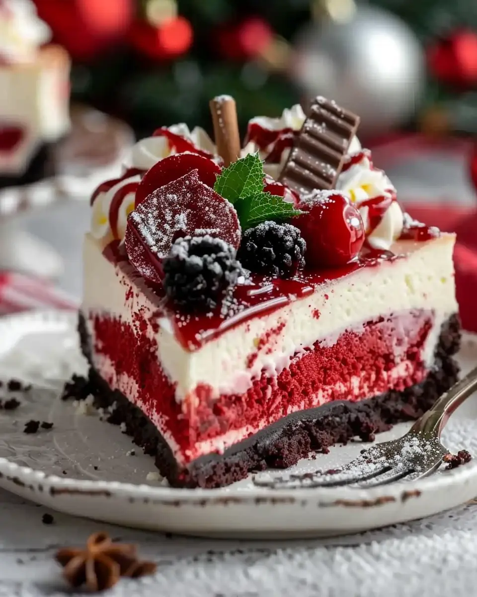 • Visual Appeal: The vibrant red color, layered with white cheesecake, is a feast for the eyes. It brings a festive charm to any dessert table, making it the highlight of your holiday spread.