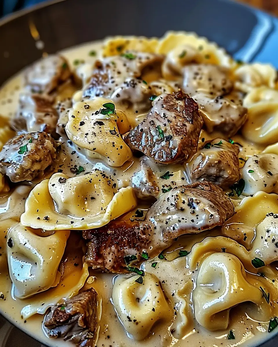 A delicious blend of steak and tortellini in a creamy sauce.