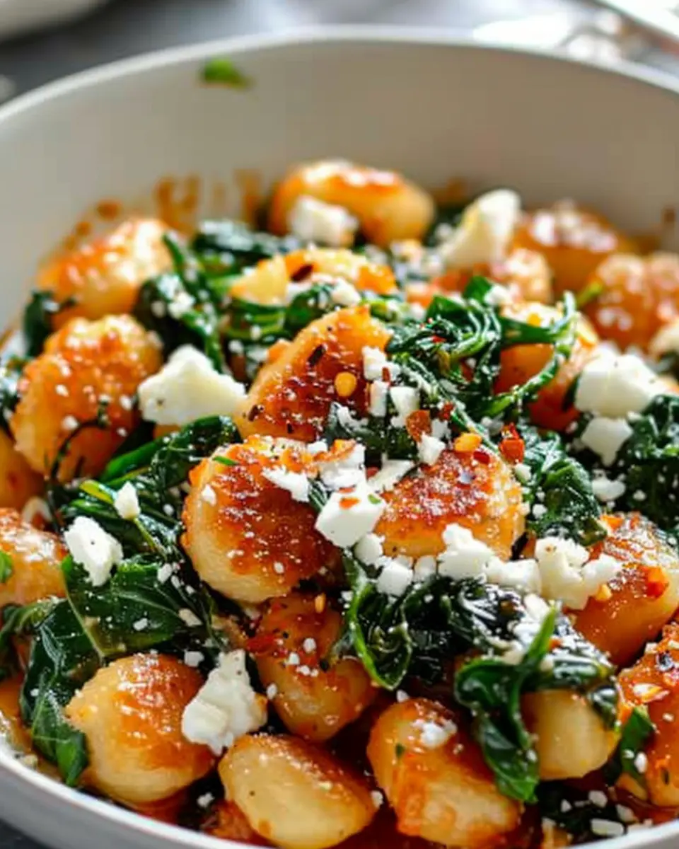 • Plate the crispy gnocchi with spinach and feta. You can garnish with a sprinkle of freshly cracked black pepper or a drizzle of your favorite olive oil for that extra flair.