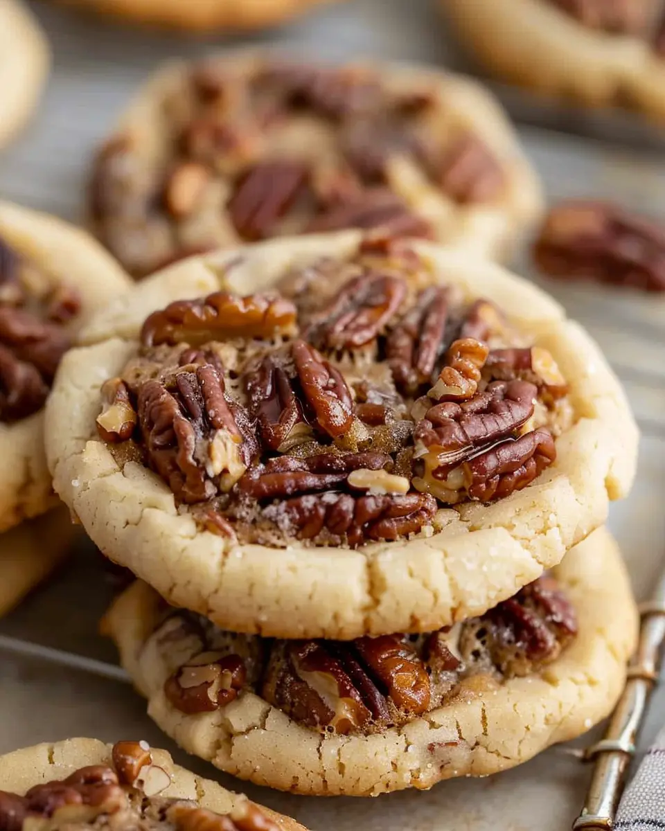 Once the cookies have cooled completely, it’s time for the fun part! Take a cookie, create a small indentation in the center, and spoon a generous amount of the pecan pie filling into that space. You can top with a few extra pecans for a stunning finish.