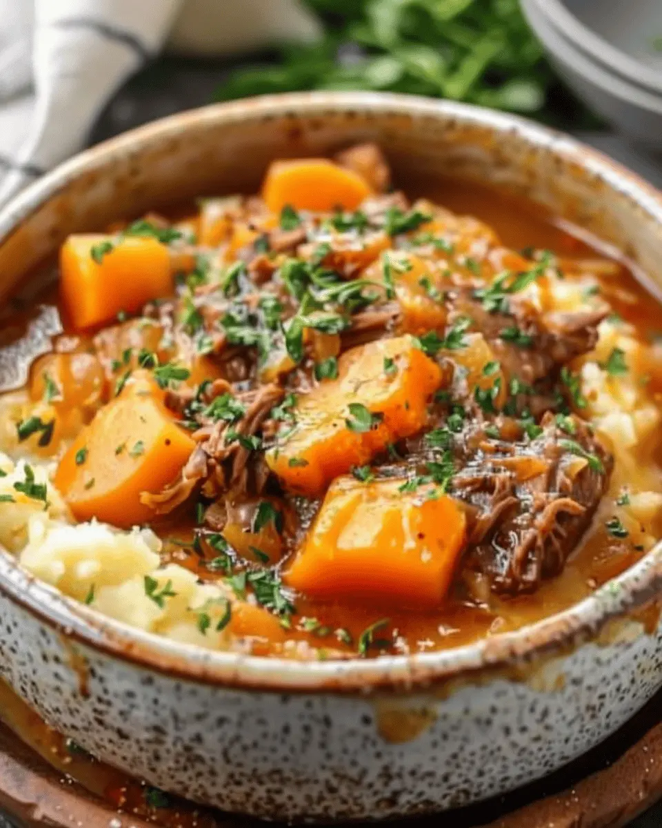 Now that everything is ready, it’s time to plate up that fall apple cider stew mash. Serve the stew over a generous scoop of mashed potatoes.
