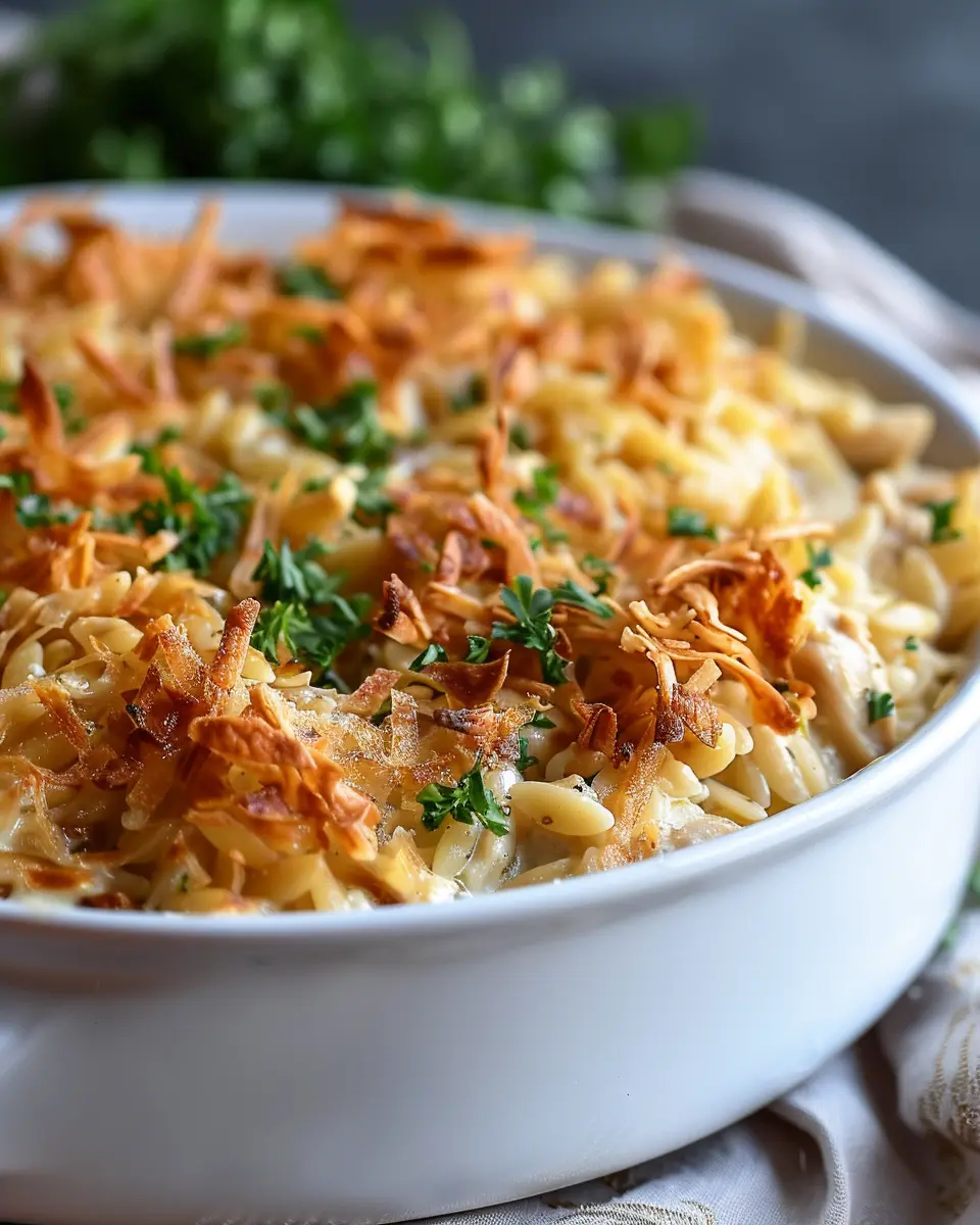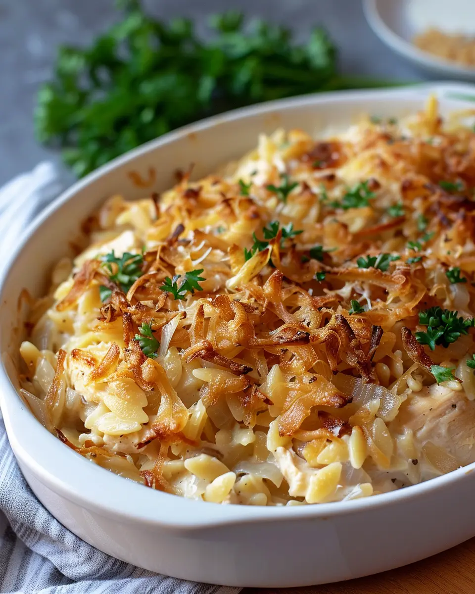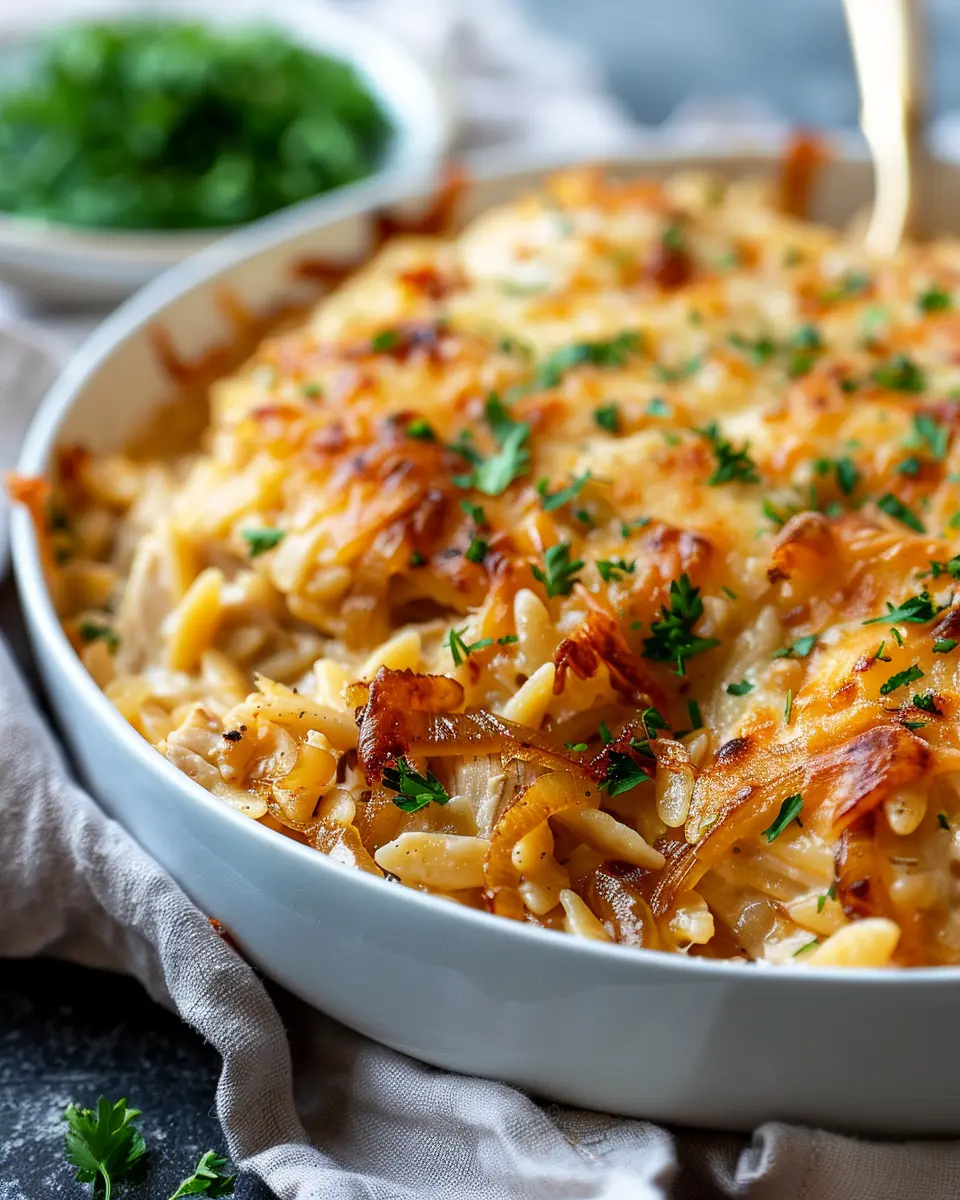 This French Onion Chicken Orzo Casserole is the ultimate comfort food, combining the rich flavors of French onion soup with tender orzo and chicken.