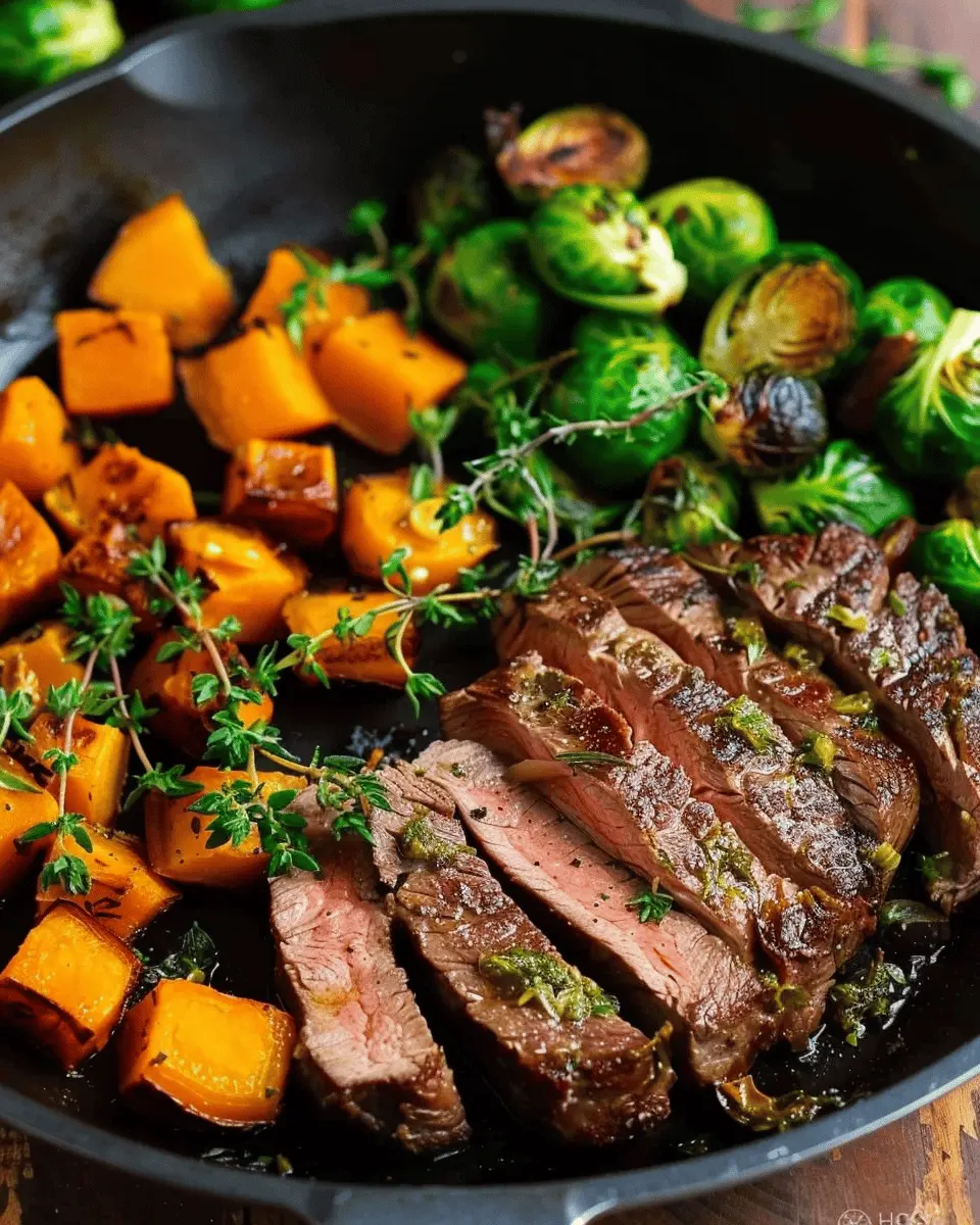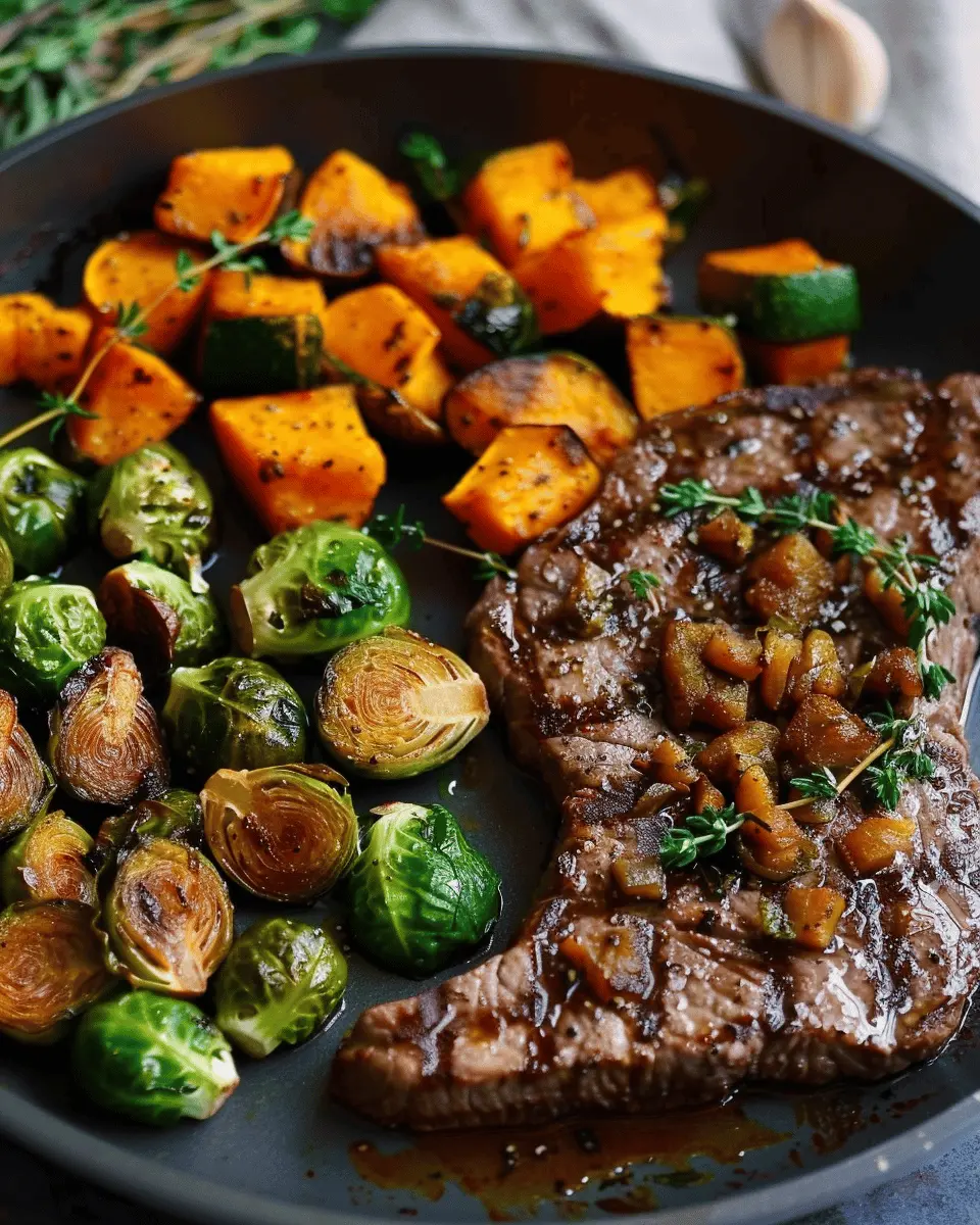This garlic butter steak dish is a delightful culinary experience that combines savory and sweet flavors, creating a comforting, wholesome meal. The tender steak pairs beautifully with the crisp Brussels sprouts and the creamy butternut squash, making for an enticing plate that’s perfect for any occasion.