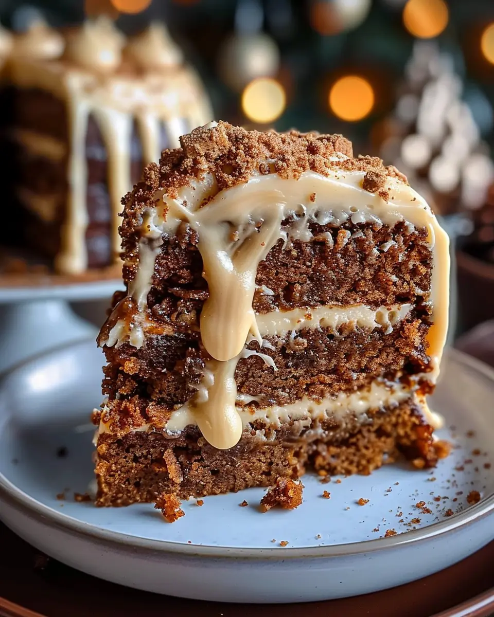 A deliciously spiced gingerbread cake topped with a creamy cinnamon molasses frosting, perfect for holiday gatherings.