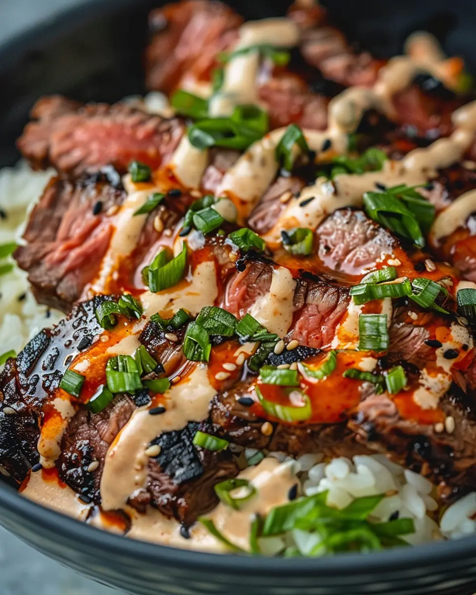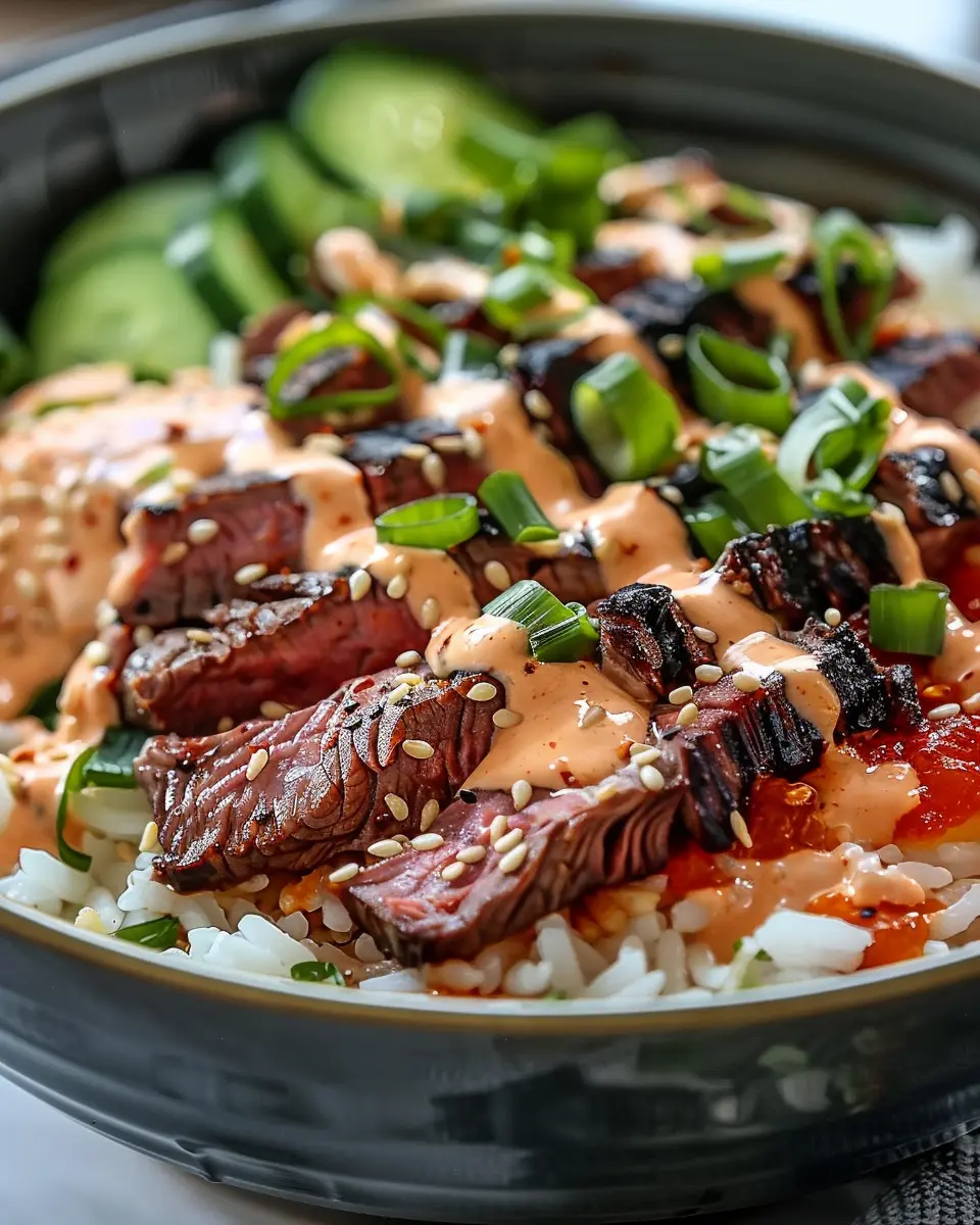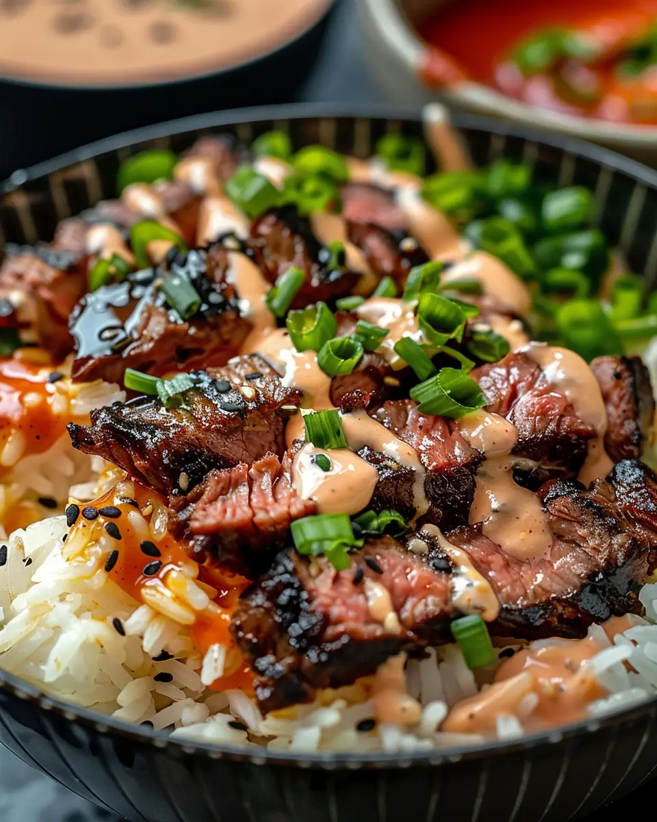 - Assemble the bowls by placing rice at the bottom, topped with sliced steak, green onions, and a drizzle of spicy cream sauce.