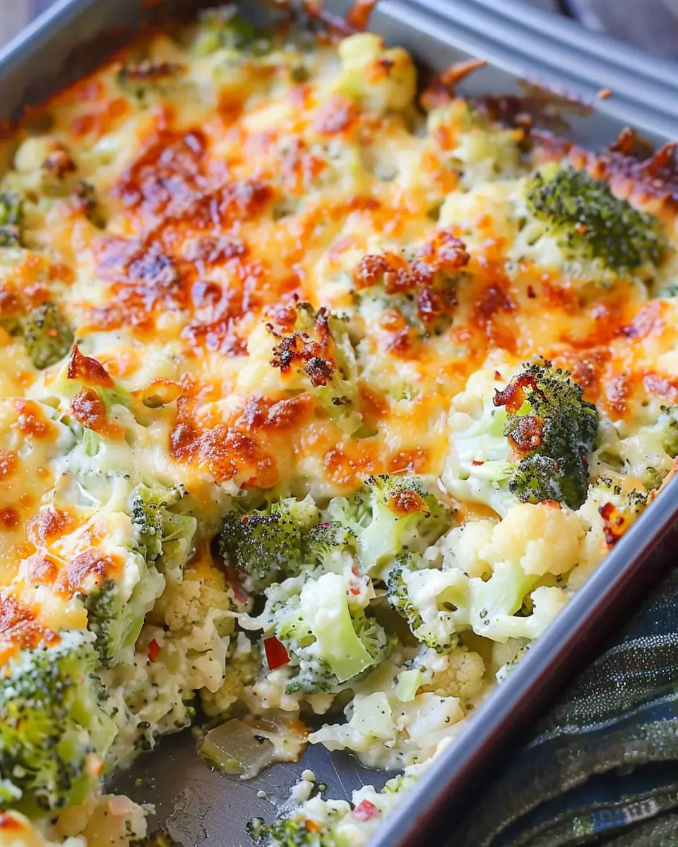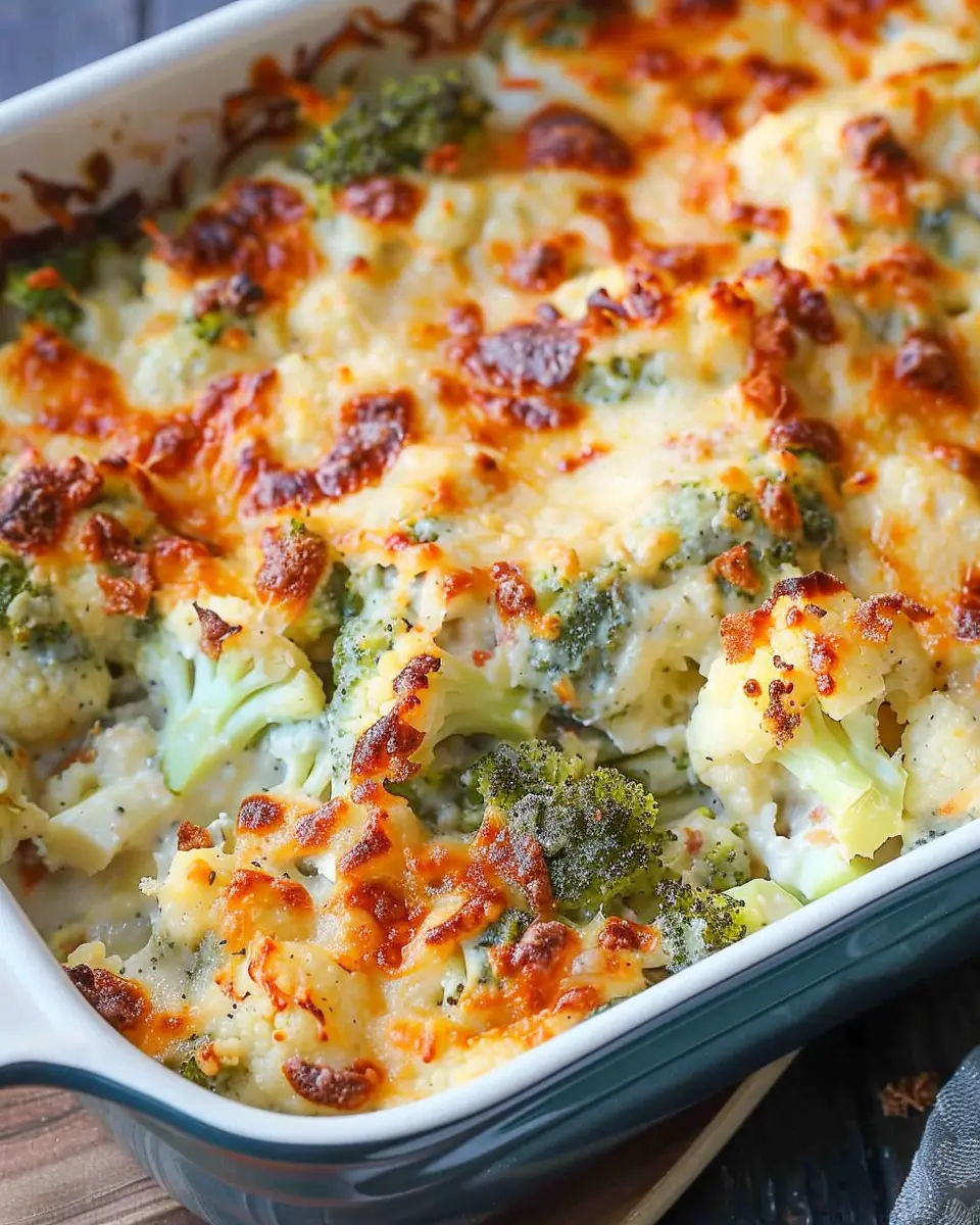 A delicious and indulgent recipe for Loaded Cauliflower Broccoli Casserole that combines hearty vegetables, creamy cheese, and savory flavor.