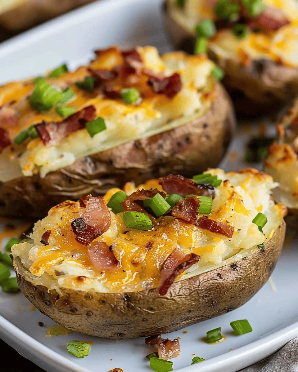 Loaded Twice Baked Potatoes are a delicious and indulgent dish that combines the savory flavors of turkey bacon and chicken ham, making them a perfect comfort food option.
