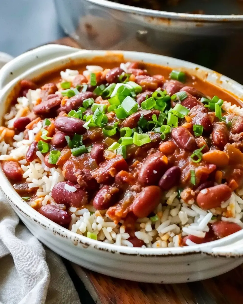 Finally, serve your flavorful Louisiana Red Beans and Rice alongside a scoop of hot white rice. For added flair, consider garnishing with chopped green onions or a dash of hot sauce for those who like it spicy.