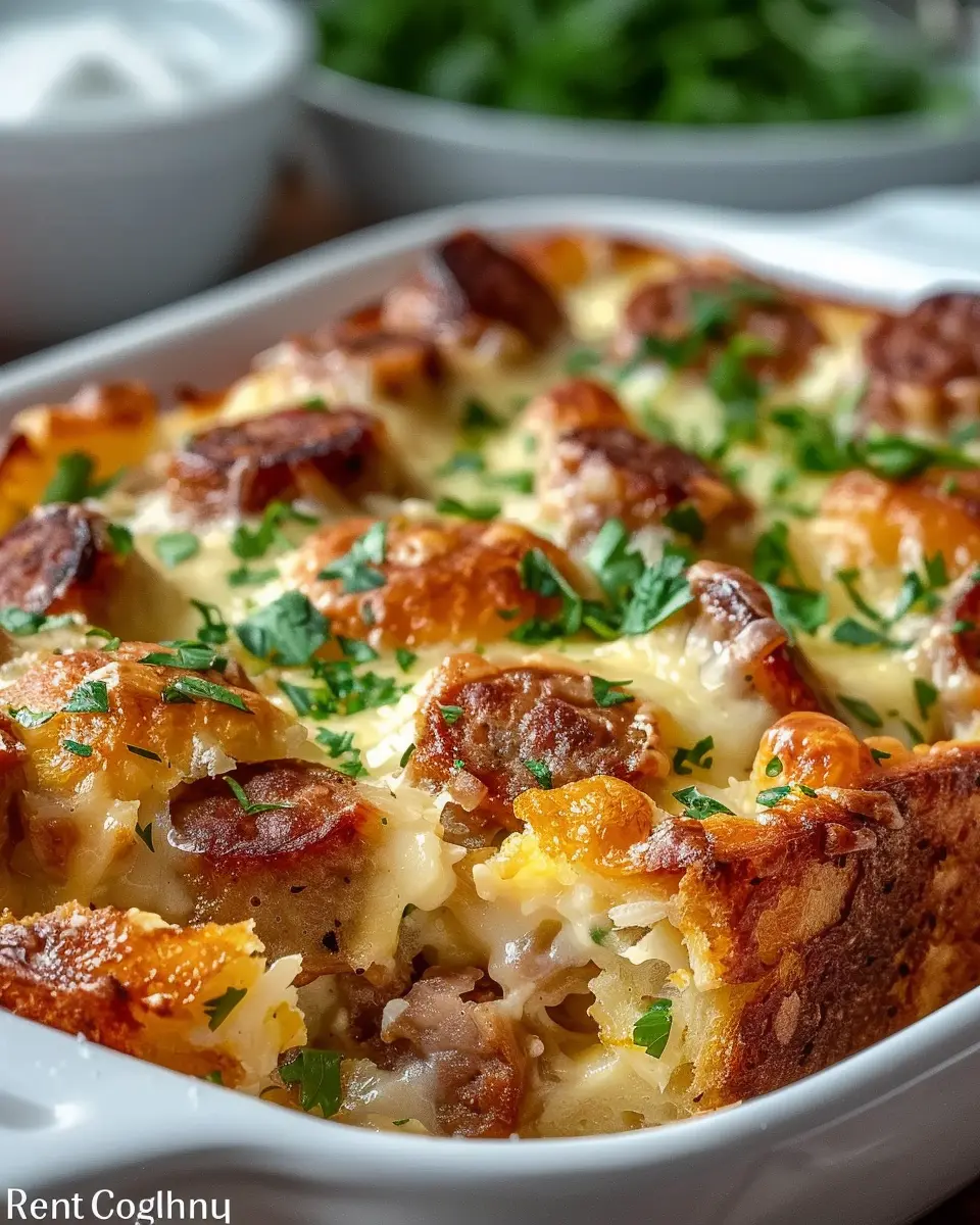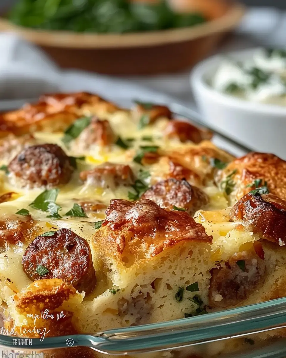 Keywords: Make-Ahead Sausage Gruyere Strata, easy comfort food, breakfast strata
