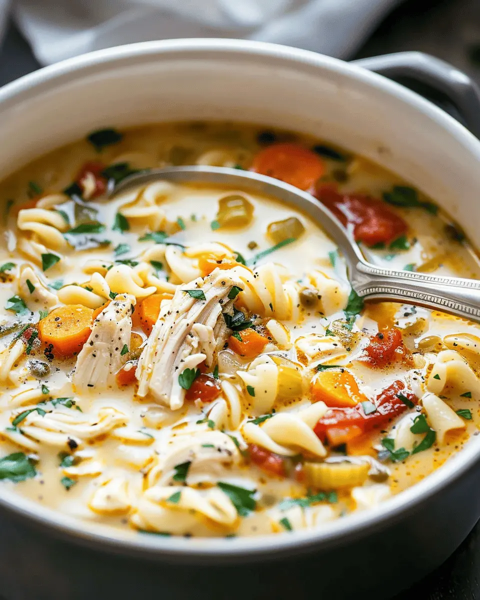 Now comes the magical touch that makes this soup so creamy and indulgent! Stir in a generous amount of heavy cream or half-and-half. This will transform your broth into a rich and silky sauce that clings beautifully to the chicken and veggies. Don’t forget to season with salt, pepper, and maybe even a sprinkle of Italian seasoning or fresh herbs for a flavor boost. A hint of freshly cracked black pepper always rounds out the dish nicely.