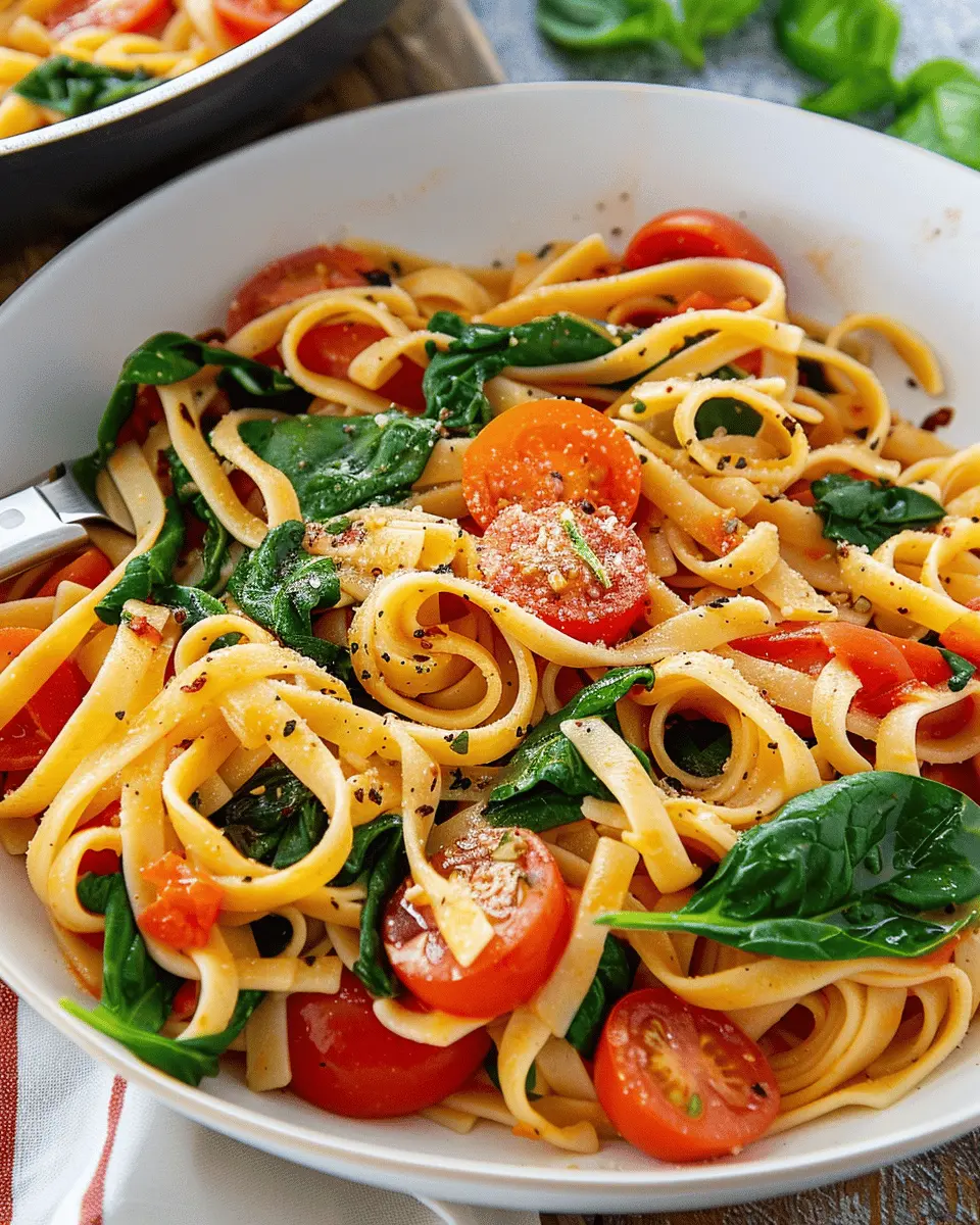 • Spinach: About 2 cups of fresh spinach, which will give your pasta dish a nutrient boost