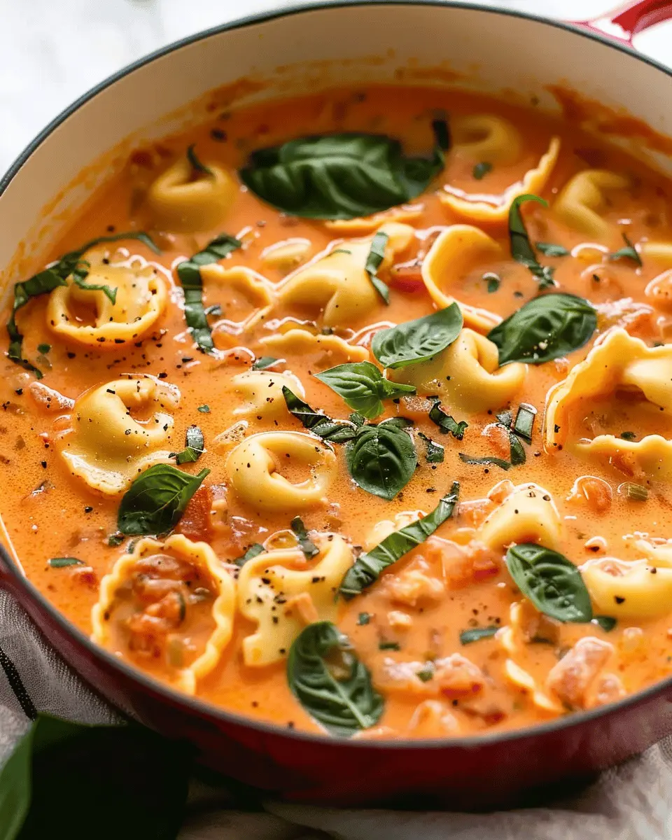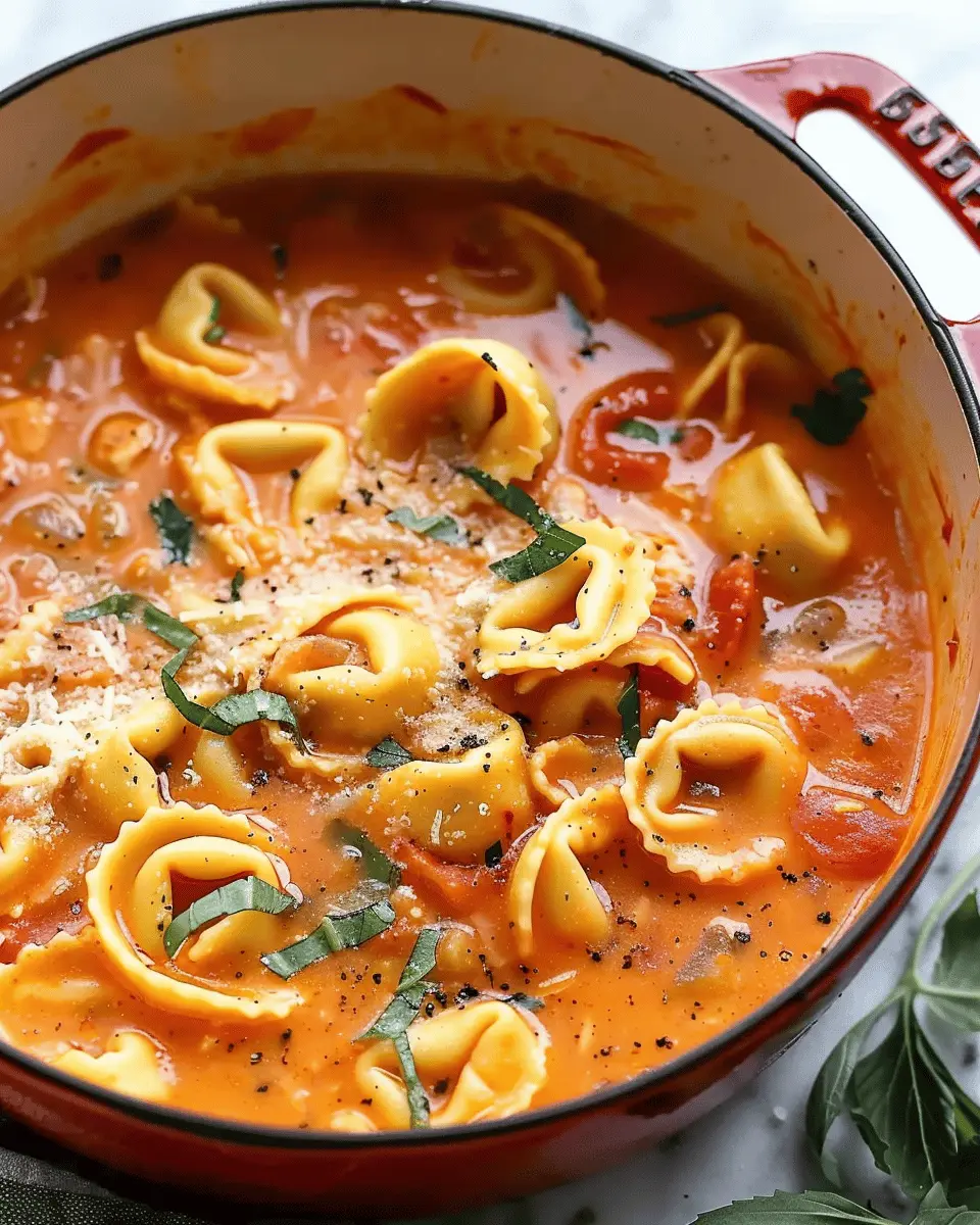 Warm and comforting, this one-pot soup combines creamy tomato flavors with tender tortellini for a delightful meal.