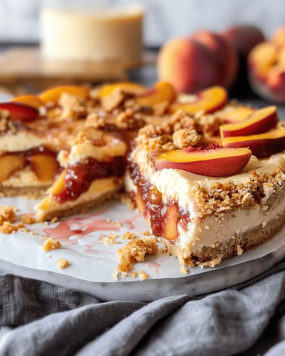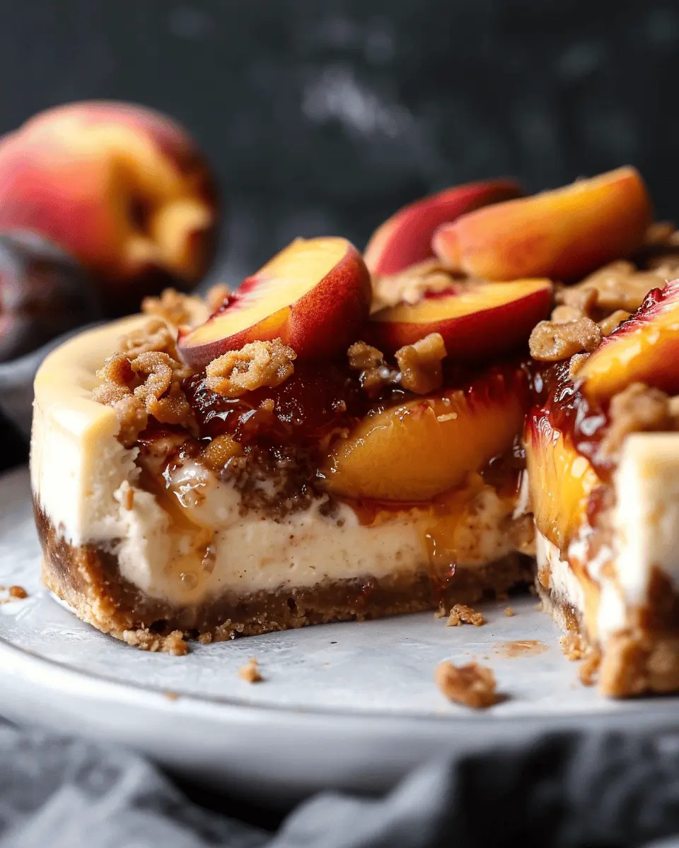 A delicious twist on the classic peach cobbler, this cheesecake combines creamy textures with fruity flavors.