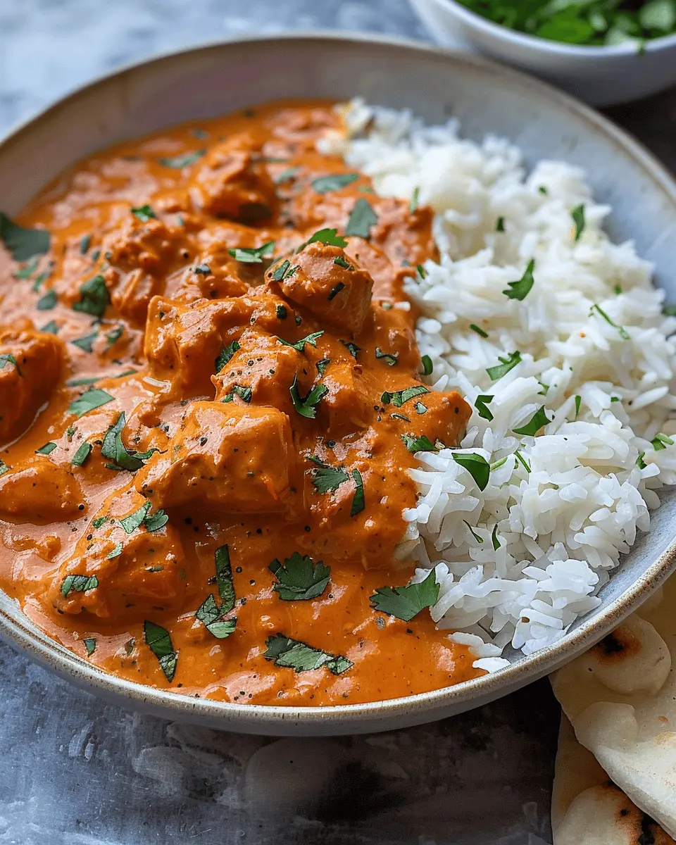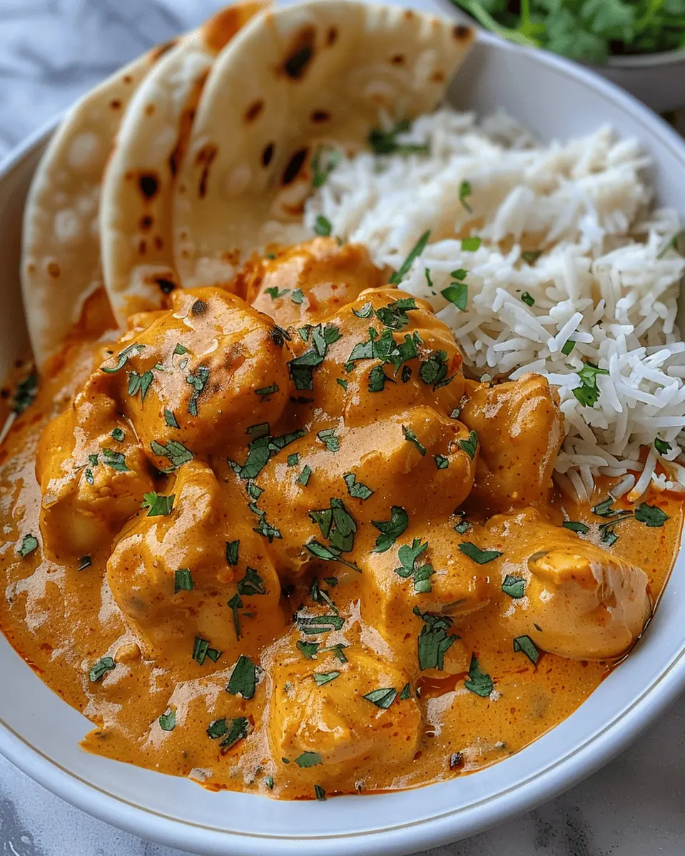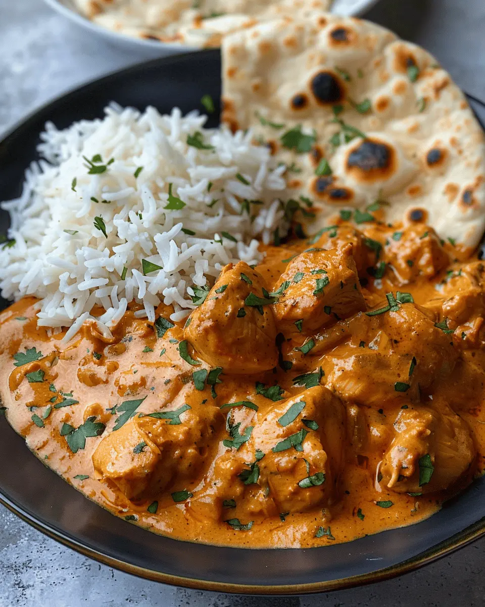Plate your Quick & Easy Homemade Butter Chicken with a side of warm naan and fragrant basmati rice. Garnish with fresh cilantro for an extra touch.