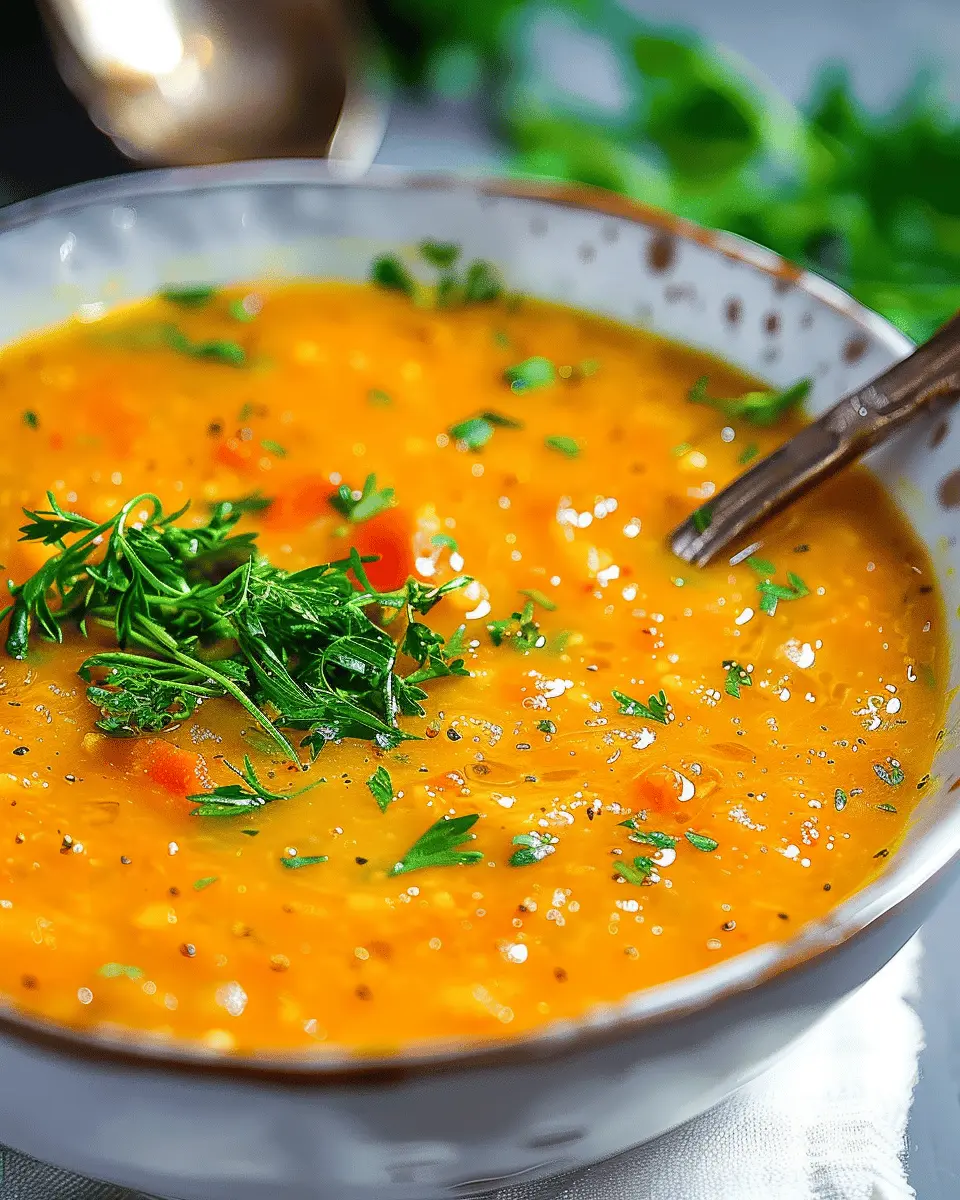 For a beautiful presentation, serve your red lentil soup with a sprinkle of fresh herbs on top. This adds a vibrant touch and freshness to your bowl.