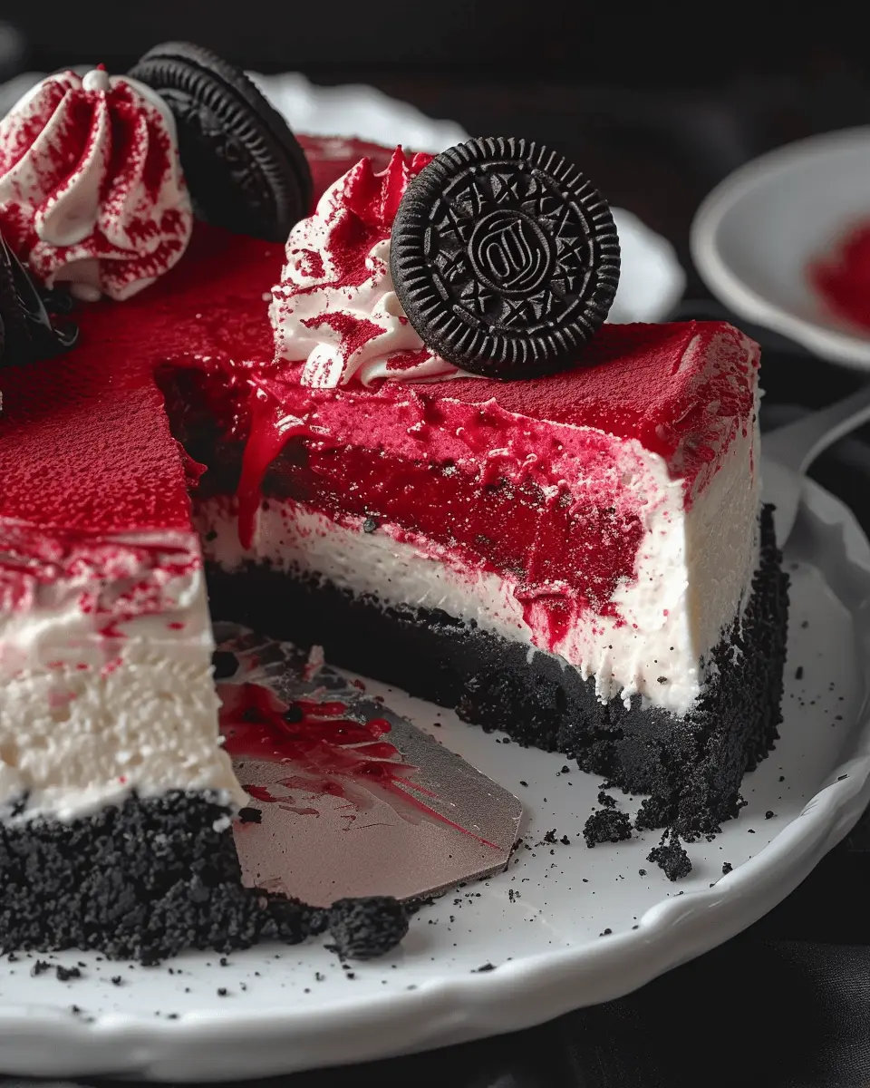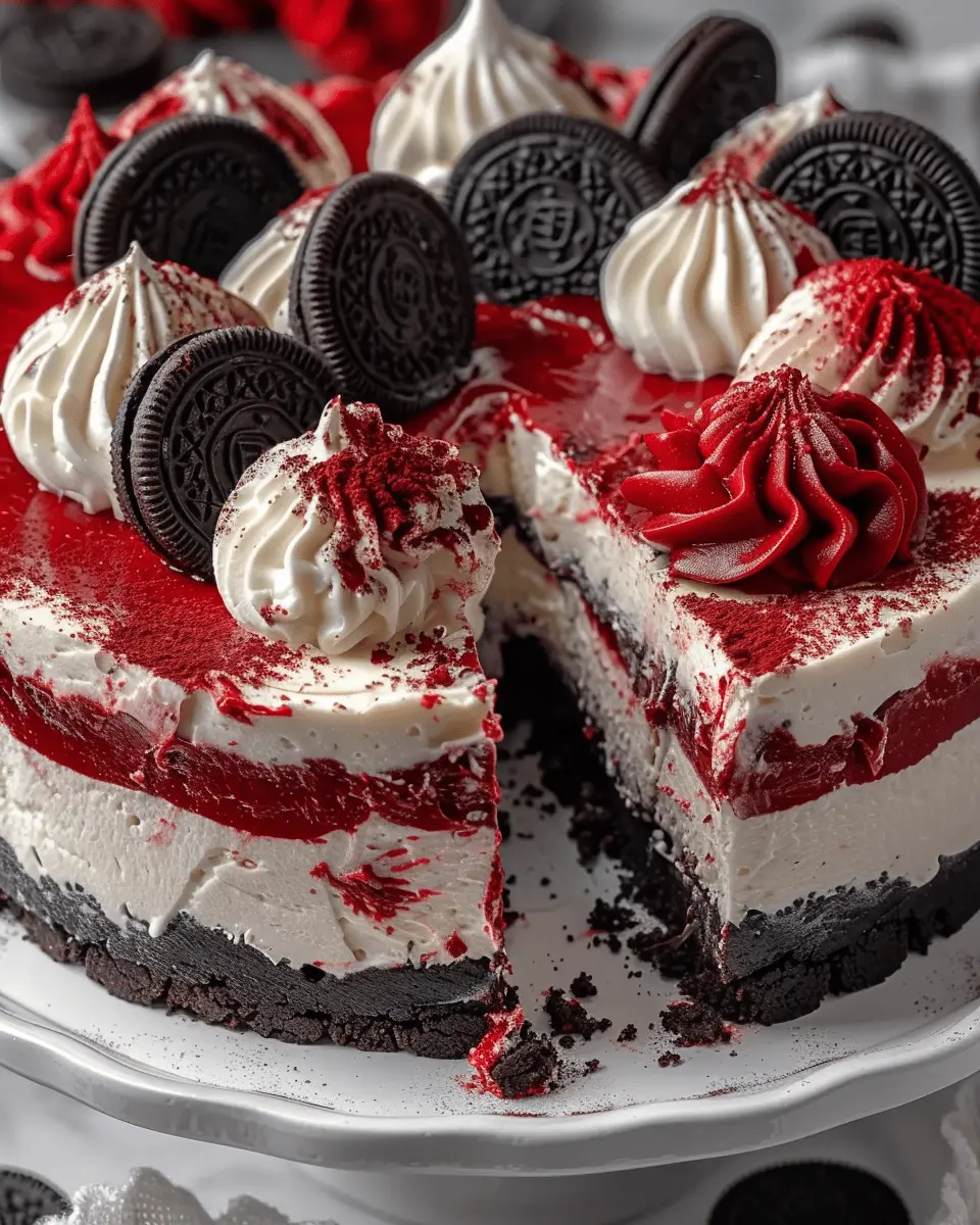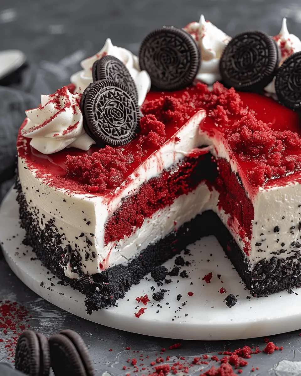 Indulge in the rich and creamy flavors of this delightful Red Velvet Oreo Cheesecake, perfect for any occasion.