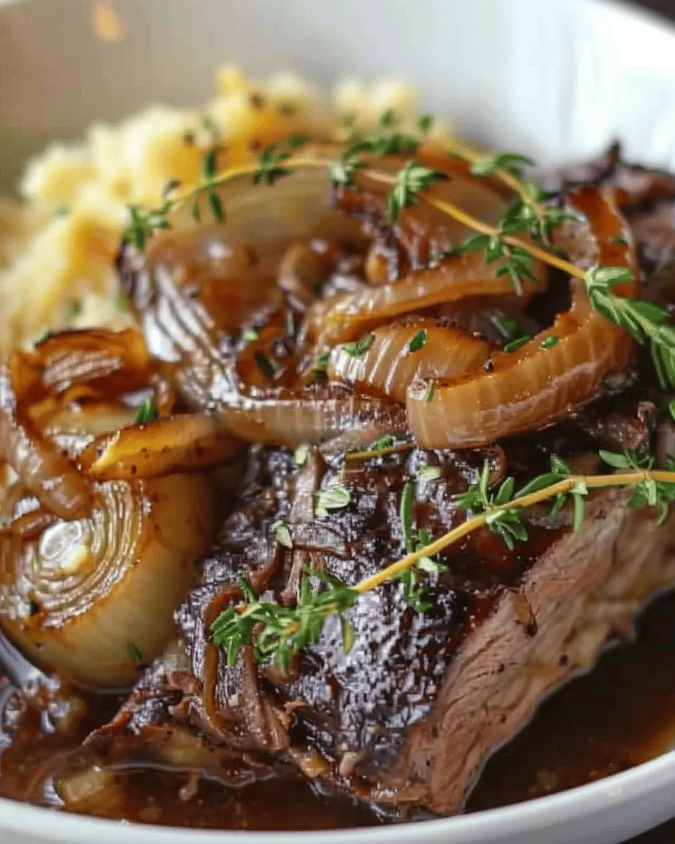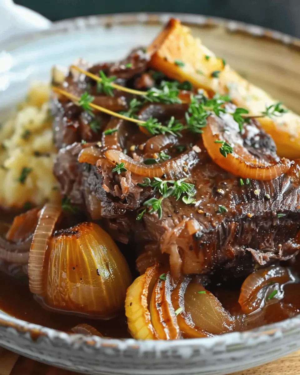 PrintSavory French Onion Pot Roast Recipe: A Juicy Twist with Turkey Bacon