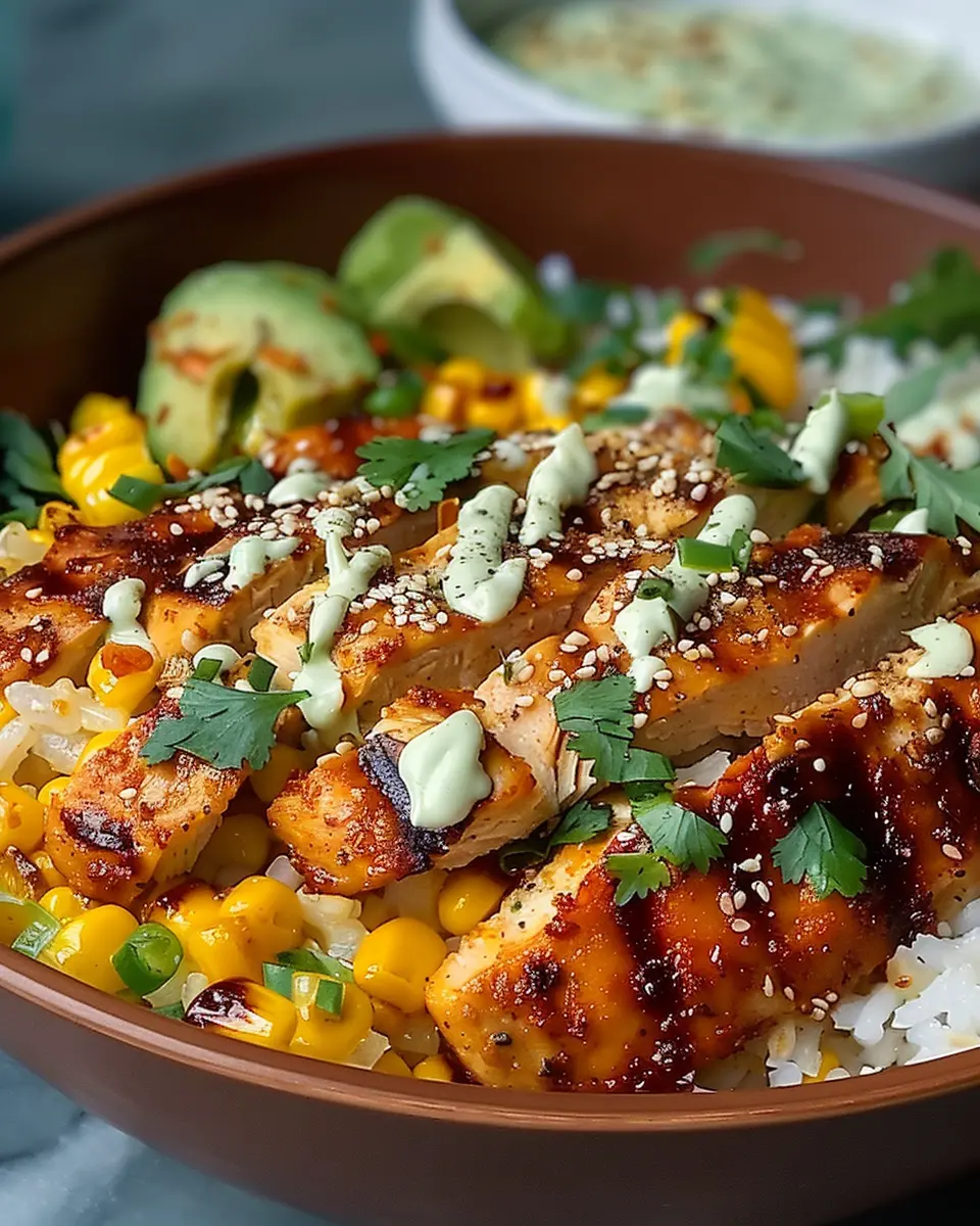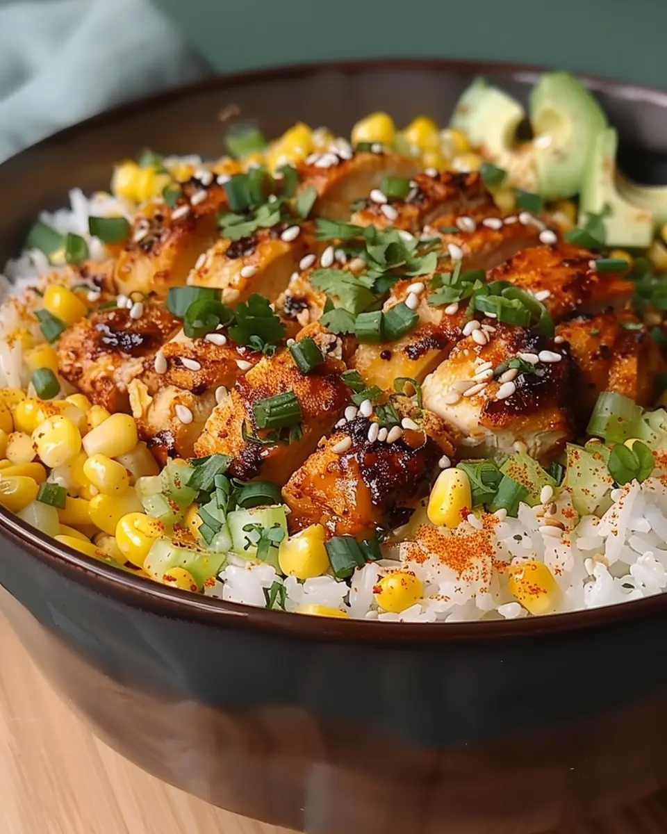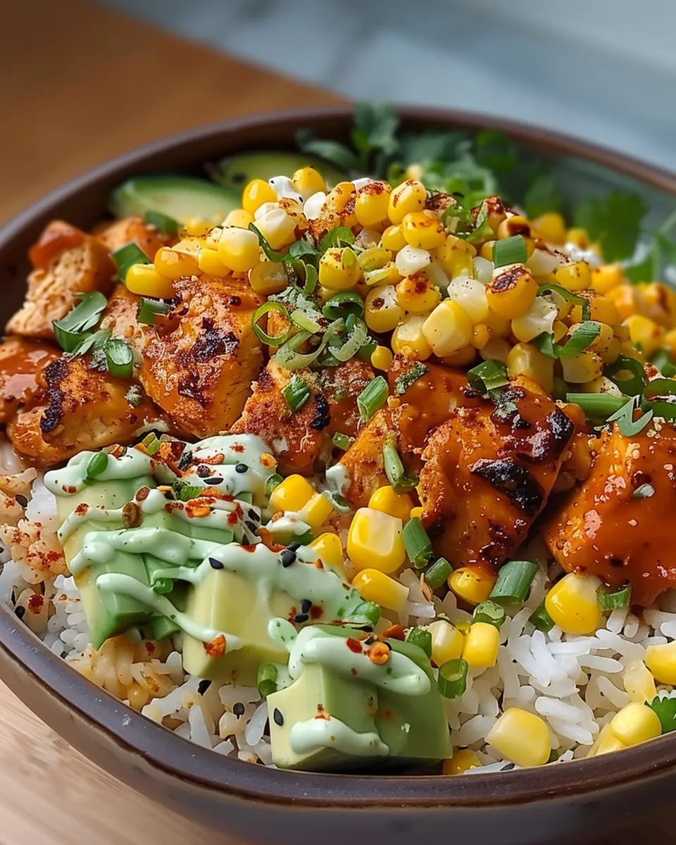 A delicious and satisfying street corn chicken rice bowl that brings together vibrant flavors and comforting textures.